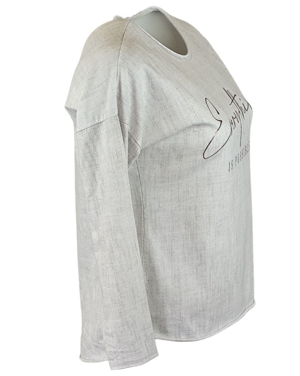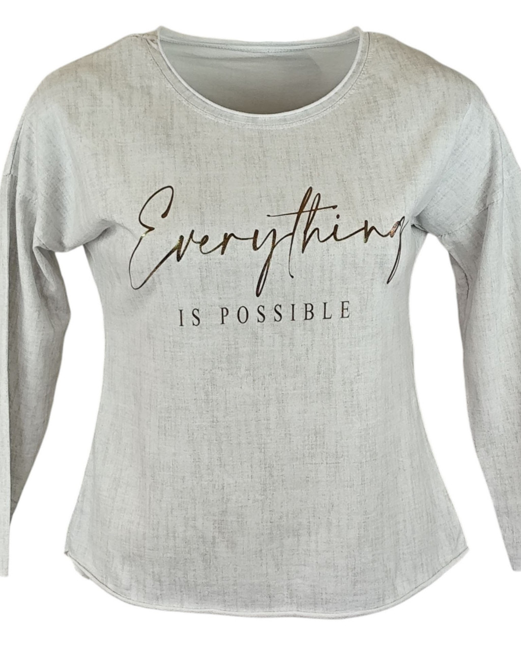 Arany feliratos elejű, hátul sima egyszínű, vastagabb pamut anyagból készült, karcsúsított, hosszú ujjú, környakú, fiatalos olasz felsőrész- fehér