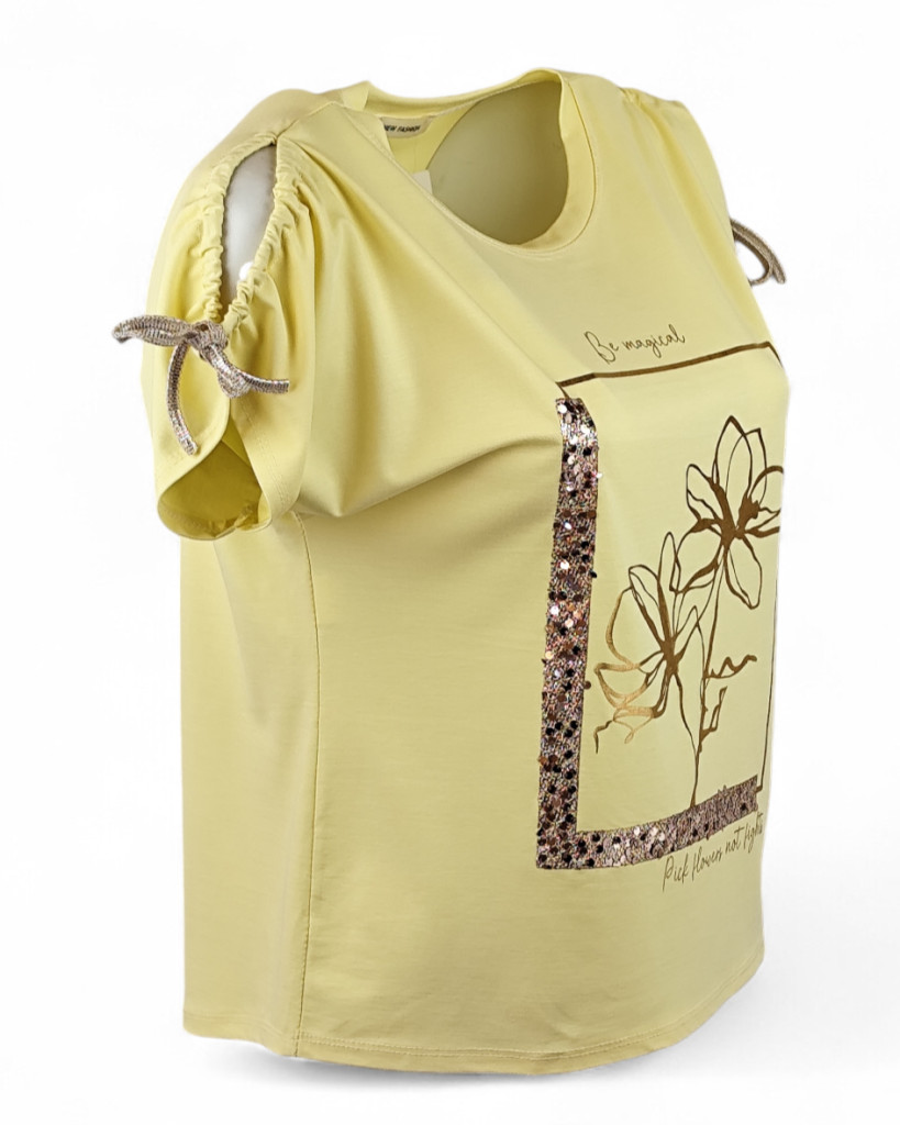 Arany négyzetben, 2 szál arany virággal díszített, viszkóz anyagból készült, lyukas vállú, rövid megkötős ujjú, fiatalos olasz felsőrész- vanília sárga, arany
