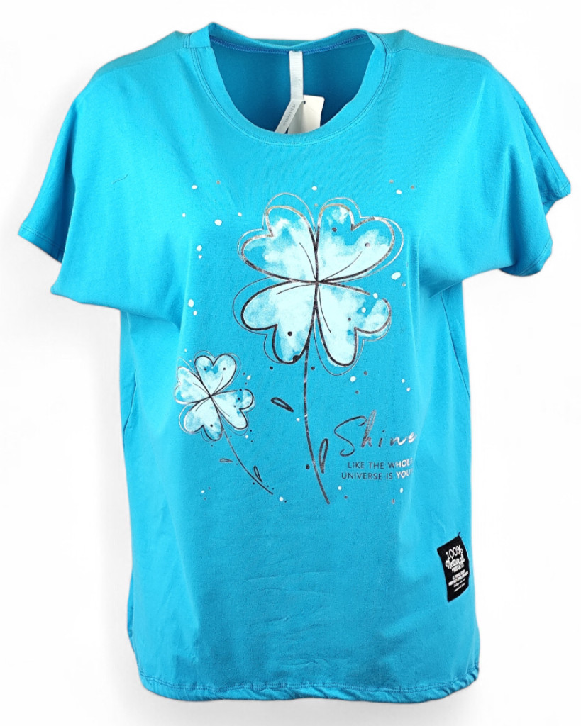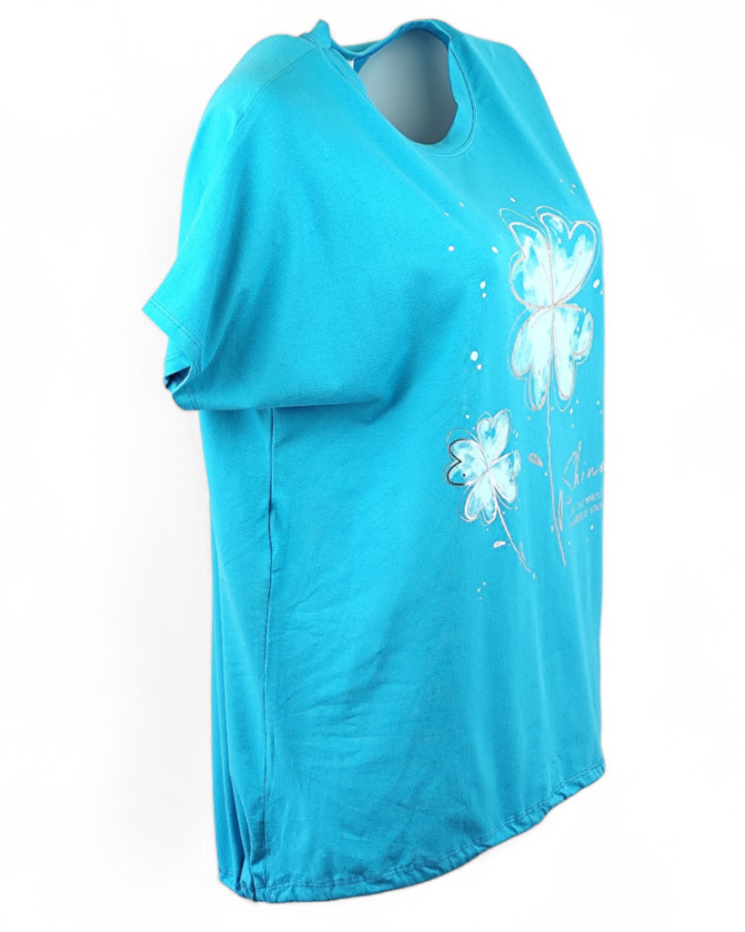 Fehér virággal díszített elejű, pamut anyagból készült, madzaggal behúzható aljú, rövid ujjú, fiatalos olasz tunika- kék