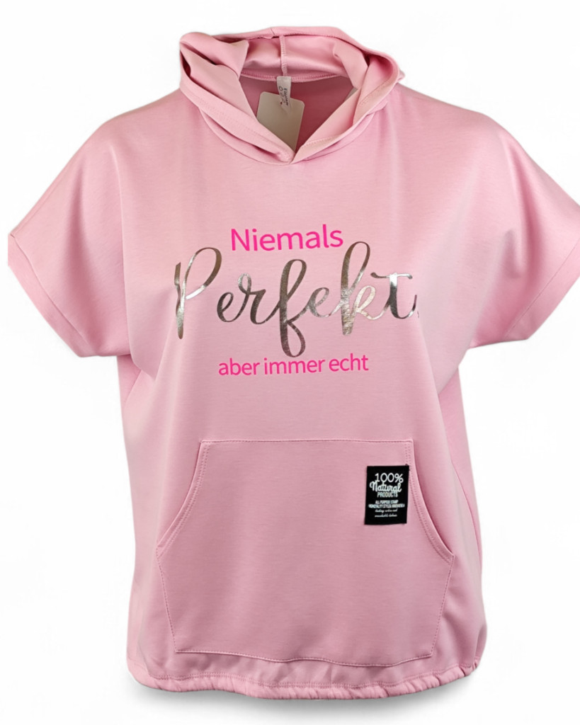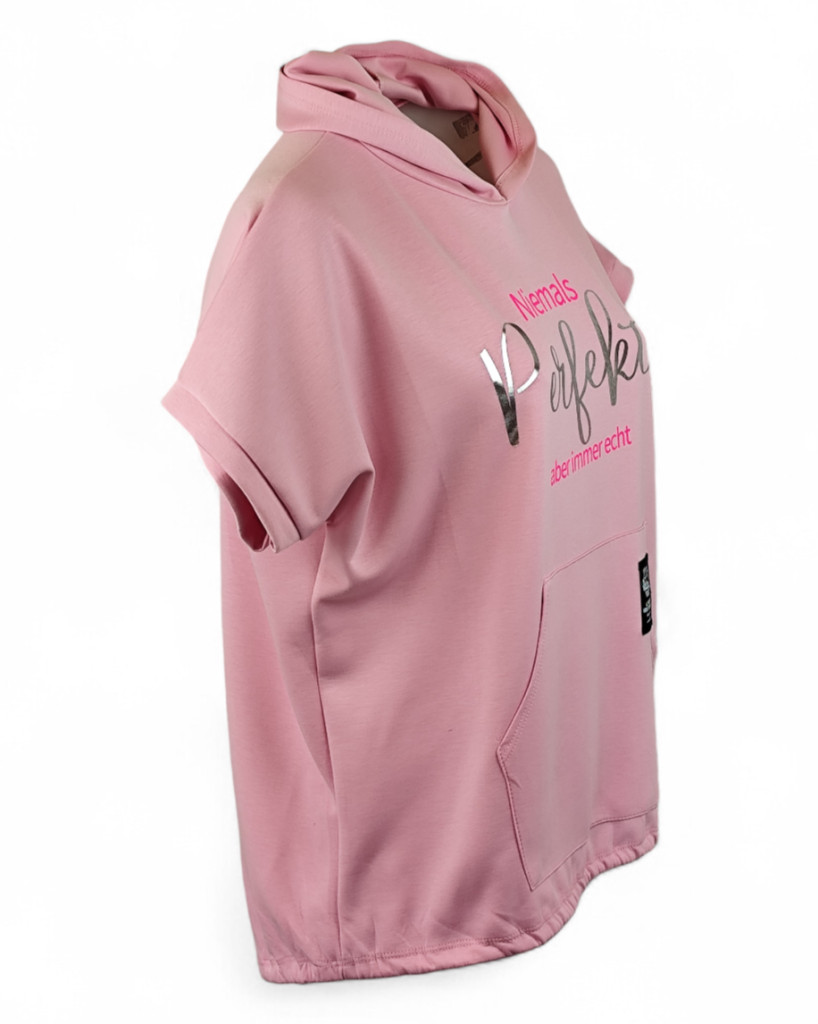 Feliratos, kenguru zsebes, kapucnis, rövid ujjú, viszkóz anyagból készült, fiatalos, sportos, olasz tunika- rózsaszín