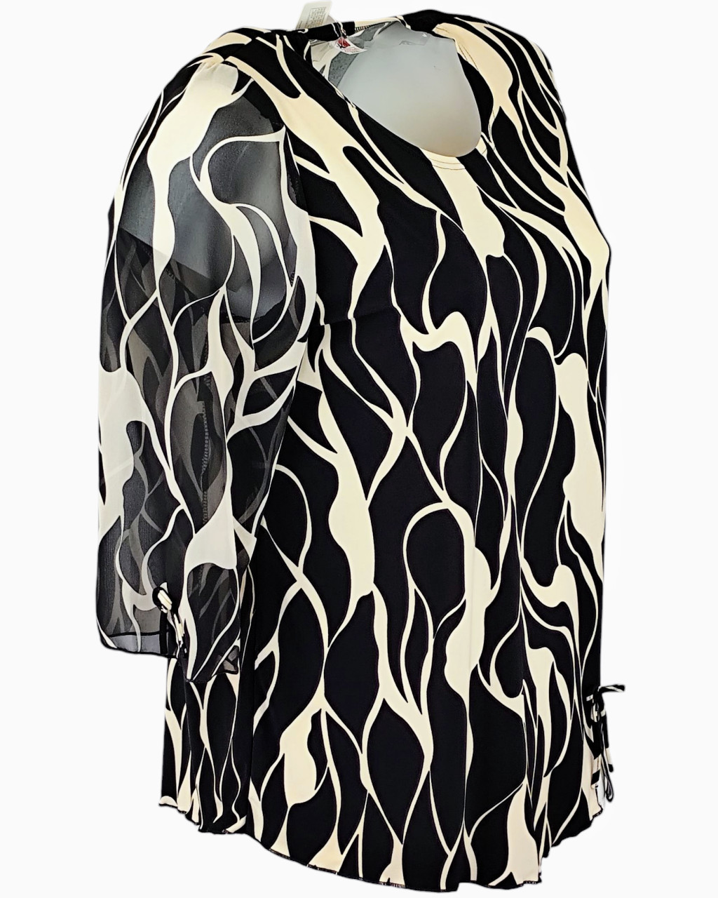 Maggi 3/4-es muszlin ujjú, környakú, fekete alapon drapp mintás, molett lengyel tunika- fekete, drapp
