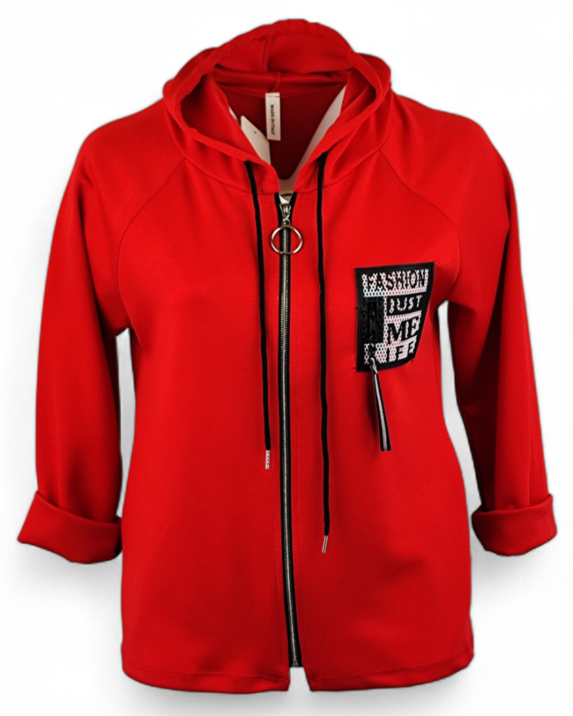 Egyenes fazonú, kapucnis, rövidebb állású, puntó kardigán fekete bőr táblával az elején- piros