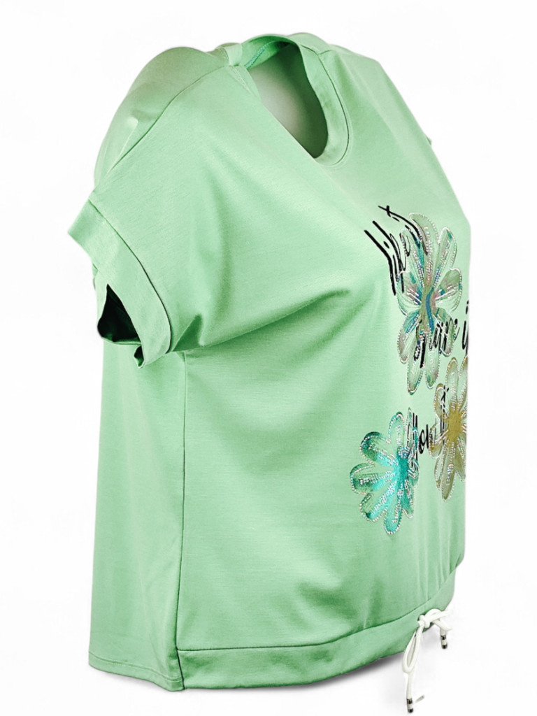 Három csillogós virágfejjel díszített, környakú, rövid ujjú, viszkóz anyagból készült, fiatalos felsőrész, húzható zsinórral az alján- almazöld