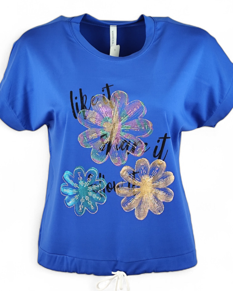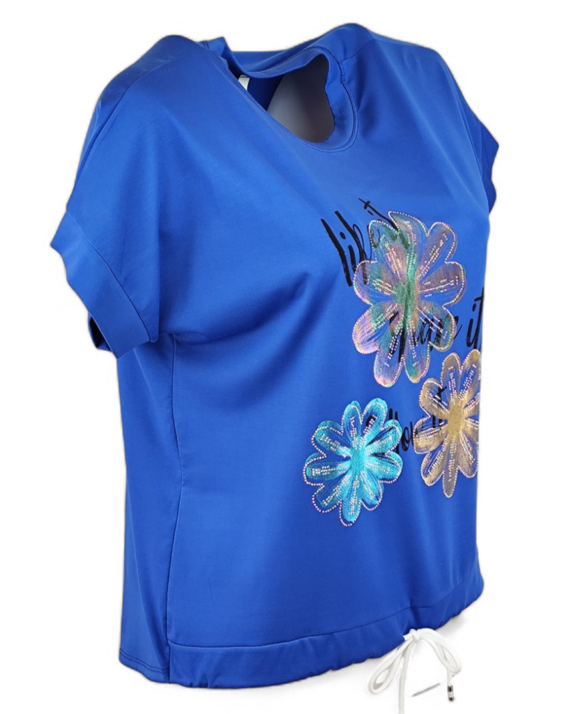 Három csillogós virágfejjel díszített, környakú, rövid ujjú, viszkóz anyagból készült, fiatalos felsőrész, húzható zsinórral az alján- királykék