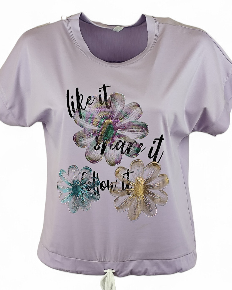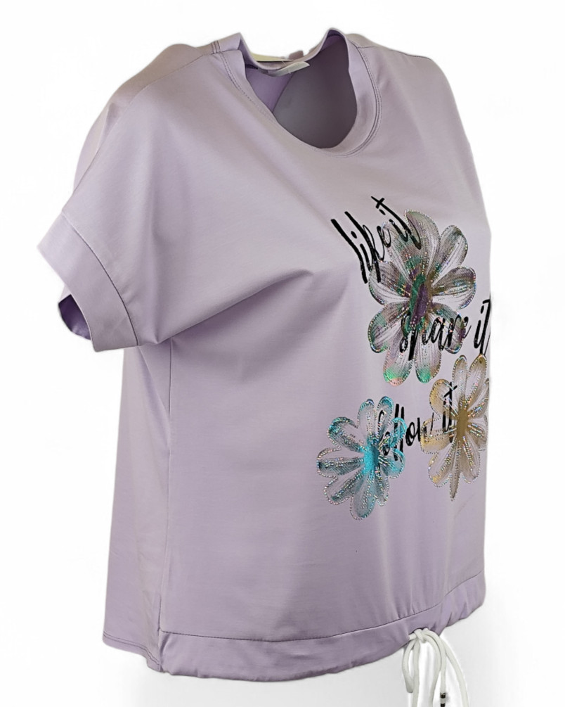 Három csillogós virágfejjel díszített, környakú, rövid ujjú, viszkóz anyagból készült, fiatalos felsőrész, húzható zsinórral az alján- világos lila