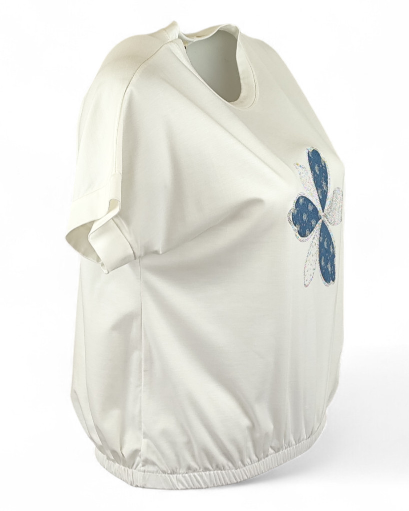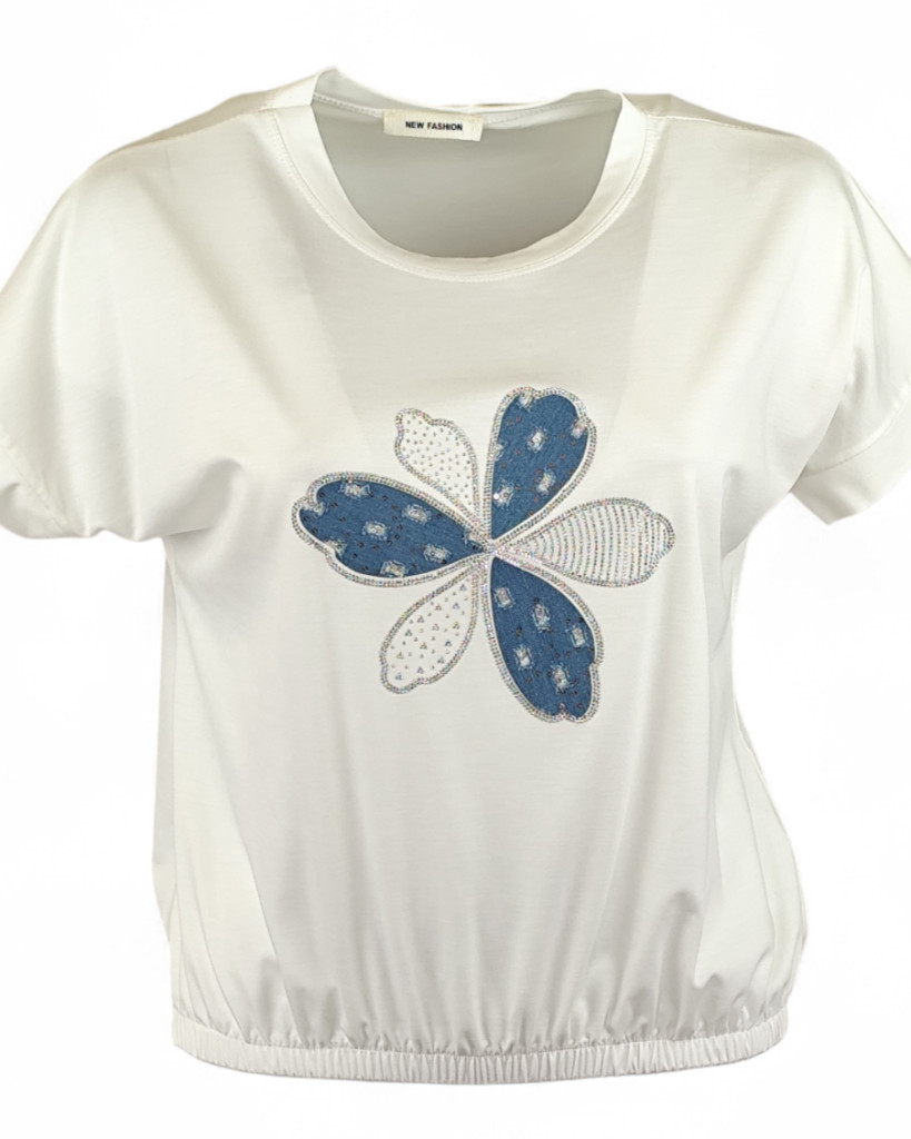 Farmeros, csillogós virágfejjel díszített elejű, környakú, rövid ujjú, viszkóz anyagból készült, gumírozott aljú, fiatalos felsőrész- fehér